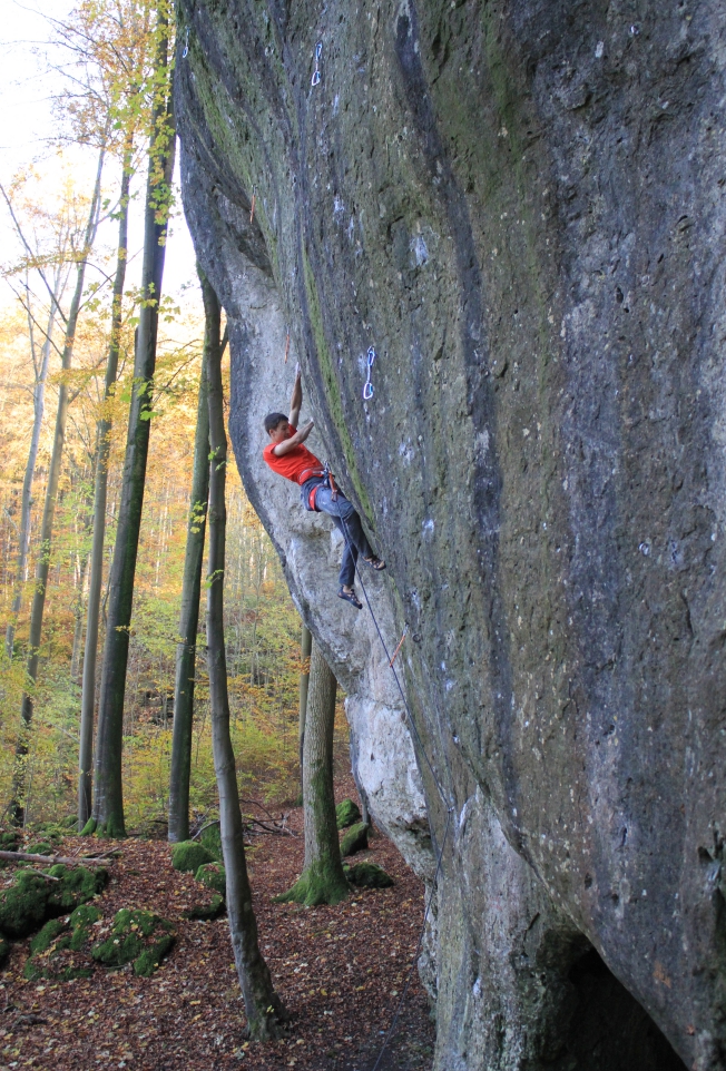 Veröffentlicht 01/11/2014 mit 652 × 962 in The Essential (9a) in Frankenjura Sticked the 2nd deadpoint move (c) Louisa Firnenburg