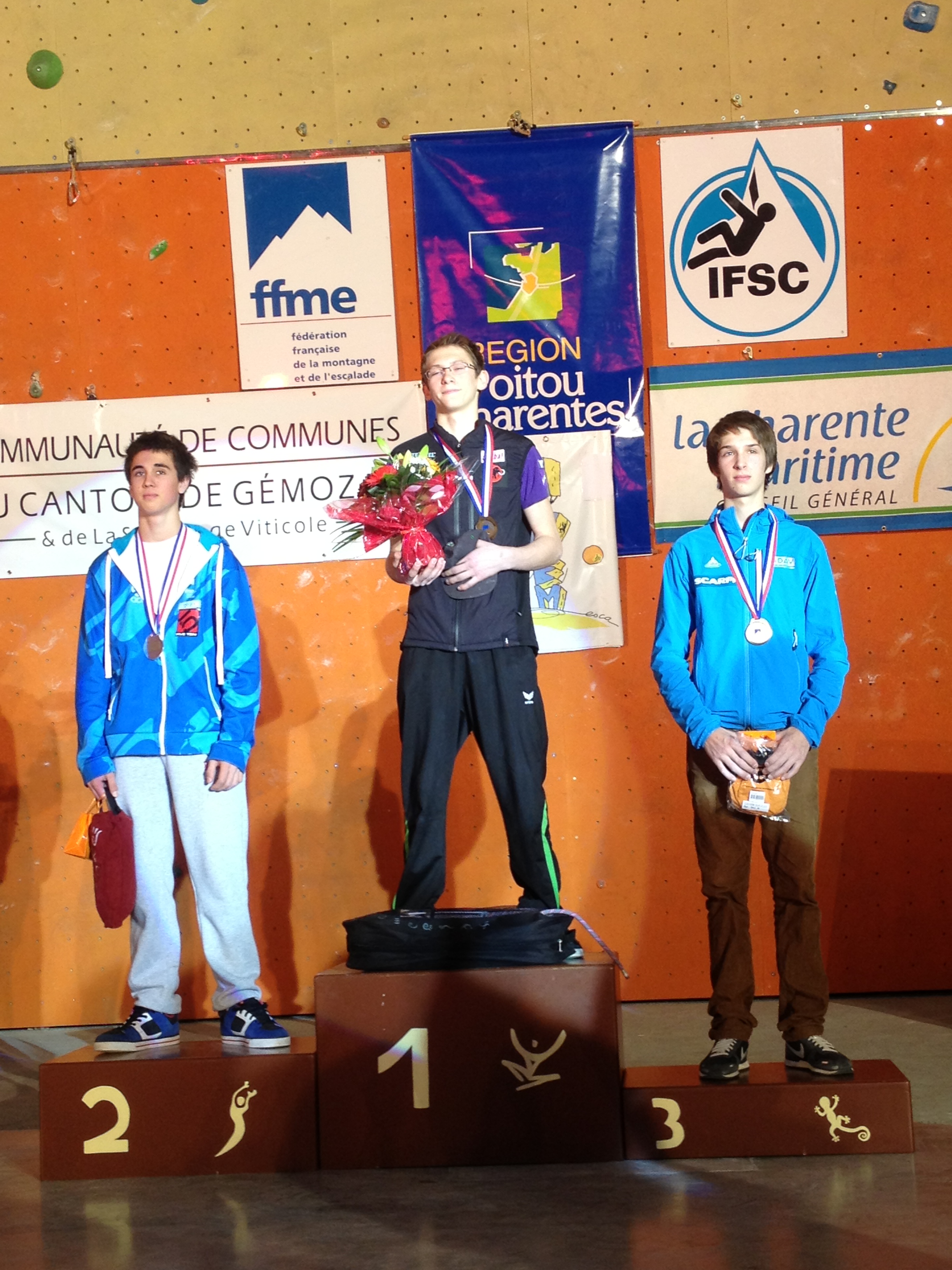 In the qualifications we performed well and could easily reach the finals. For the Youth A and Juniors category the final was already on Saturday, so they had to master the stress and concentration of three competition routes in one day. David climbed well and could finish the competition season this year with a good 5th place in Gemozac. At the end it was just one and a half move more to stand on the podium.